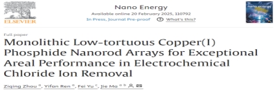 Recently, a research team led by Professor Jie Ma has made significant progress in the field of capacitive deionization for chloride removal from industrial wastewater. The related findings, titled "Monolithic Low-tortuosity Copper(I) Phosphide Nanorod Arrays for Exceptional Areal Performance in Electrochemical Chloride Ion Removal", have been published in the journal Nano Energy.
