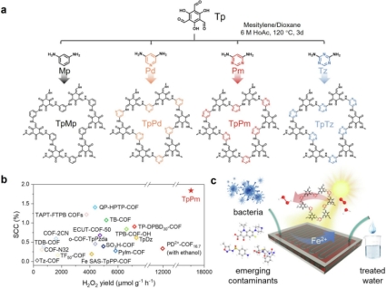 Recently, Prof. Shun Mao’s lab from CESE published a paper titled “Nitrogen heterocyclic covalent organic frameworks for efficient H2O2 photosynthesis and in situ water treatment” in Nature Communications (2025, 16: 6943). This study designs four covalent organic framework-based photocatalysts with varying nitrogen atom configurations to tune their electronic and energy-band structures, which achieve an efficient H2O2 production in pure water without sacrificial agent or oxygen aeration. The constructed reactor under natural sunlight demonstrates continuous H2O2 generation performance for antibiotic degradation and long-lasting water disinfection. This study provides new insights into efficient photocatalytic H2O2 production and possible scalable applications for in situ water treatment.