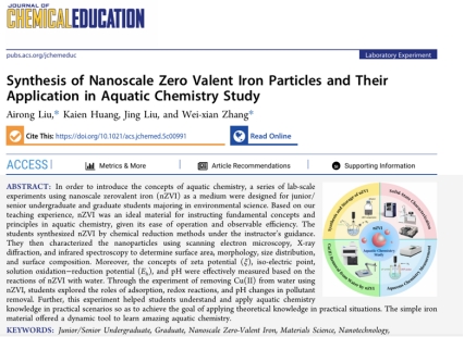 Recently, Journal of Chemical Education, a leading international journal in chemical education under the American Chemical Society, published an important teaching and research achievement by Airong Liu and other teachers from CESE, titled "Synthesis of Nanoscale Zero-Valent Iron Particles and Their Application in Aquatic chemistry study" (DOI: 10.1021/acs.jchemed.5c00991). Founded in 1924, Journal of Chemical Education is a flagship SCI journal in the global field of chemical education, enjoying high authority and extensive influence in the international chemical education community. The publication of this paper marks a breakthrough for our college in publishing research in top-tier international journals in the field of chemical education.