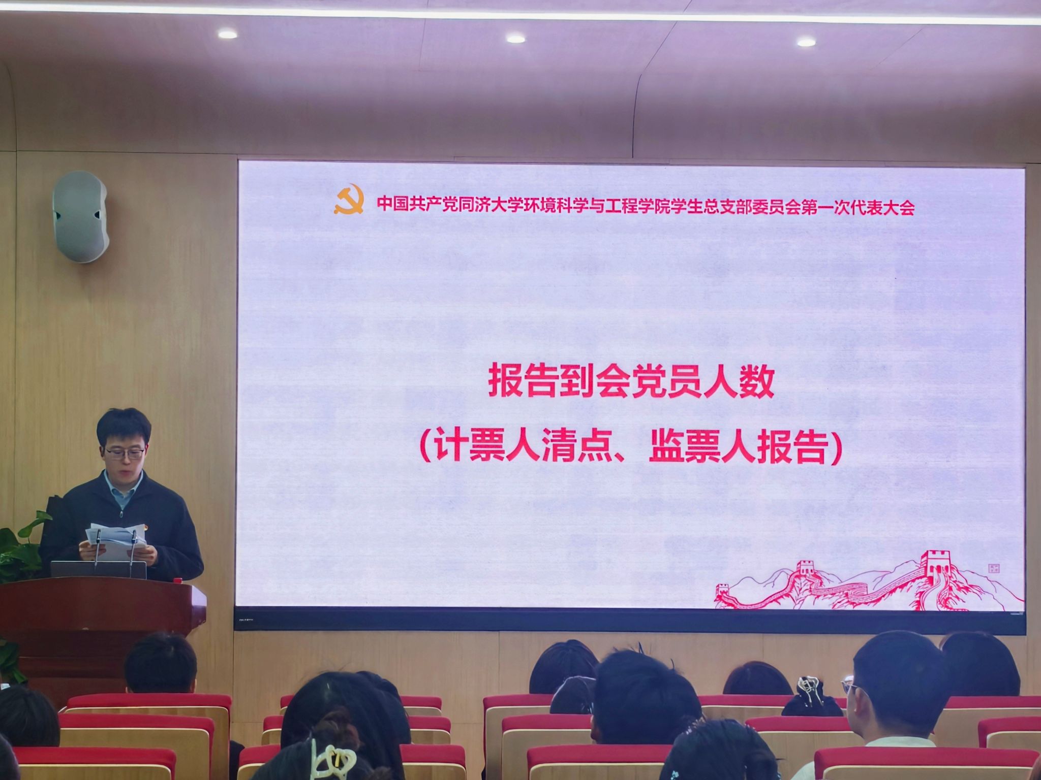 在黄圣洁同志的主持下,大会表决通过了选举办法和总监票人、监票人名单,并宣布了计票人名单。总监票人周经洲同志主持选举工作,大会采用差额选举的办法和无记名投票的方式,选举产生了中共同济大学环境科学与工程学院第一届学生总支部委员会委员。