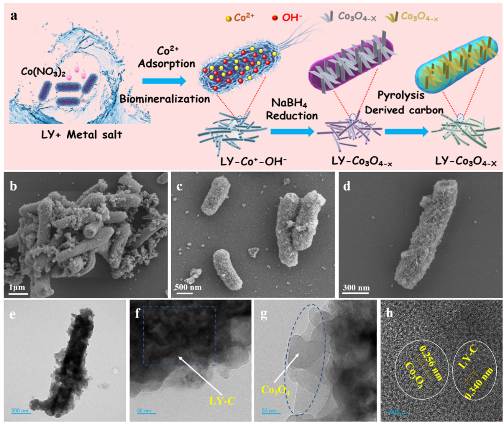 基于前期酵母“代谢转化”合成NiCoP@NPC(Adv. Science., 2024, 2407616)和聚磷菌的“代谢催化”合成LFP@C(Nano today, 2024, 102781)进行离子分离的研究基础,本研究创新性采用 Bacillus cereus“生物矿化”功能,成功构建了一种由中空衍生碳棒(LY)包覆富含氧空位的Co3O4-X纳米片(LY-Co3O4-X)的复合电极材料。中空的LY不仅形成了三维导电网络,还充当支撑骨架,减轻了Co3O4-X的聚集和粉碎,从而保持了电极的活性。高度分散的Co3O4-X纳米片缩短了离子传输路径,增强了LY-Co3O4-X的反应动力学。LY-Co3O4-x的界面耦合促进了电子的重新分布和电荷的快速转移,加速了Pb2+的水合化、水化层脱除及离子分离过程。基于以上优势,LY-Co3O4-X在1.60 V的工作电压下展现出卓越的Pb²⁺去除性能(Pb²⁺吸附容量可达 78.7 mg g⁻¹,吸附速率为2.62 mg g⁻¹ min⁻¹),超越了绝大多数已报道的电极材料,并且呈现出优异的长寿命循环性能。这一发现为微生物构建金属氧化物并调控其电化学活性开辟了新途径。