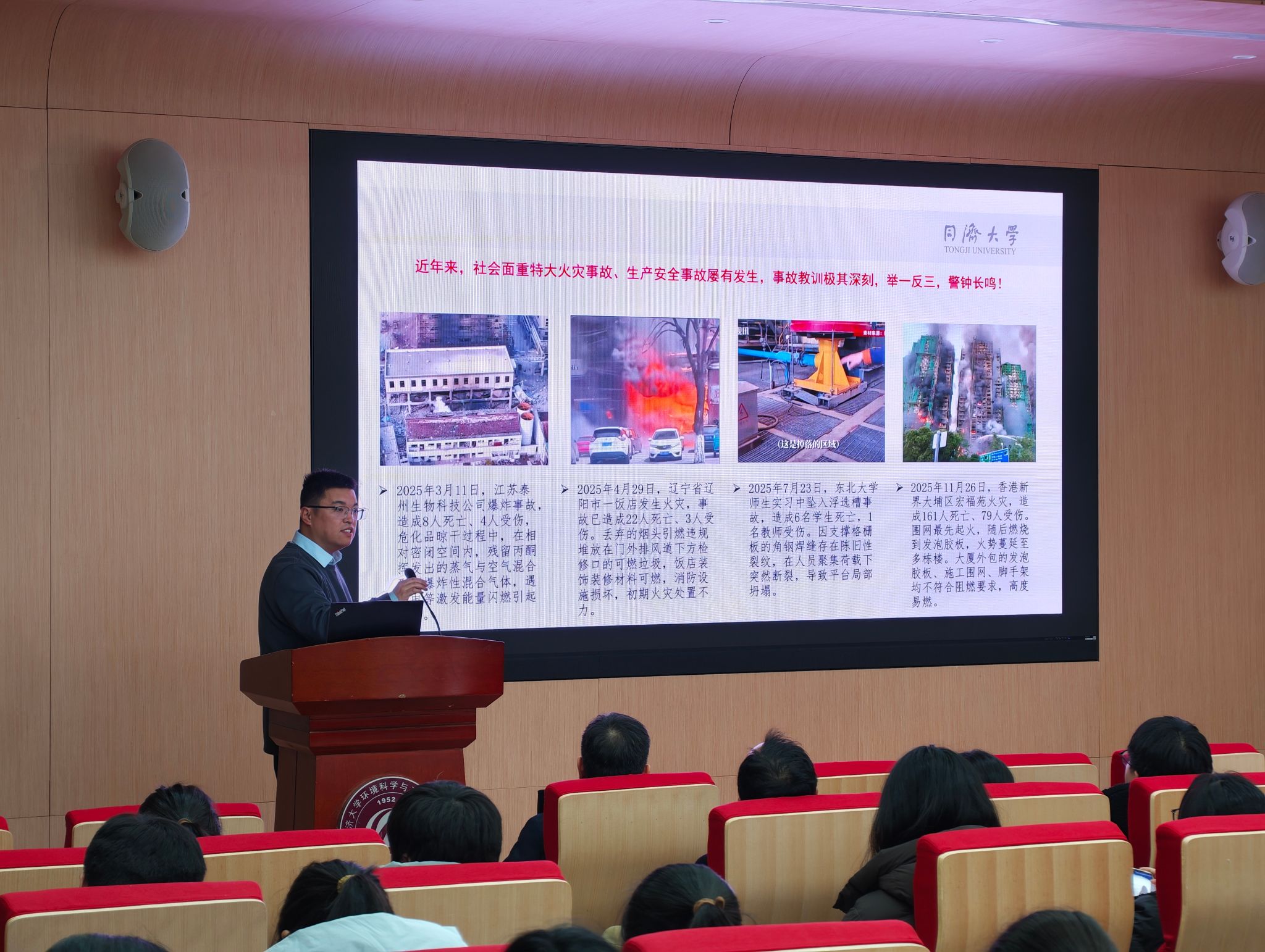 随后,学校安全生产办公室副主任贾晓航围绕“岁末年初校园安全风险防范”作了专题报告。贾老师结合岁末年初安全事故易发多发的特点,他向师生们提出四点具体要求:一是加强用火用电管理,规范实验操作,做到人走电断,严禁使用违章大功率电器,杜绝违规充电行为;二是强化重点风险管控,严格执行动火作业规范,加强对危化品、配电系统等关键部位的风险评估与管理;三是严格落实值班巡查,加强隐患排查和整改治理,确保消防等安防设施完好、安全通道畅通;四是持续提升师生安全意识,培养“三关”(关电源、关火源、关气源)“三清”(清阳台、清楼道、清实验区域)的安全习惯,及时清理易燃可燃堆物,增强防火、防诈、防盗等意识和能力。贾老师的培训内容贴近实际、案例生动,为学院近期安全工作的开展敲响了警钟、明确了重点。