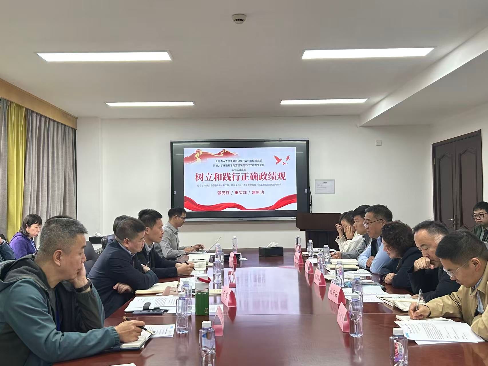 2026年4月7日下午,上海市人大常委会办公厅行政财务处党支部贺晓阳处长一行与同济大学环境科学与工程学院市政工程系党支部和水污染控制与资源绿色循环全国重点实验室党支部在同济大学明净楼118会议室举行联学联建活动。环境学院党委书记徐斌、水污染控制与资源绿色循环全国重点实验室办公室主任张华及双方党员代表共三十余人参加,会议由市政工程系主任夏圣骥主持。