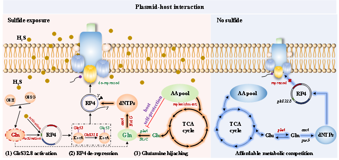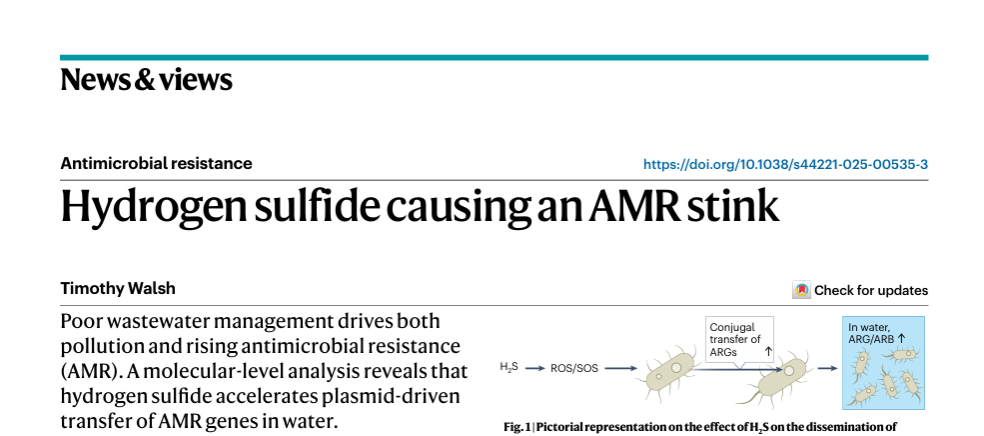 抗生素抗性基因(ARGs)通过水平基因转移进行传播,对全球健康构成重大威胁。尽管已知外源胁迫因素会促进接合转移,但内源微生物代谢物在此过程中的作用尚不明确。本研究发现在废水中普遍存在的代谢物硫化氢(H2S)是一种强效但被忽视的质粒接合促进因子,阐明了一种不同于经典SOS反应的质粒自主激活机制(图1)——RP4质粒利用其编码蛋白Upf32.8(重命名为GlsS32.8)感知细胞内谷氨酰胺水平,触发质粒去抑制,并增强从宿主窃取以谷氨酰胺为核心的代谢过程,从而在H2S环境下促进接合转移。该研究重新定义了微生物代谢物作为抗性传播关键驱动者的角色,并为理解质粒-宿主相互作用以遏制ARGs扩散提供了重要见解。欧洲科学院院士、牛津大学Timothy Walsh教授在Nature Water撰写题为“Hydrogen sulfide causing an AMR stink”评论(图2)。论文第一作者为黄海宁助理教授,通讯作者为陈银广教授和郭建华教授(昆士兰大学)。