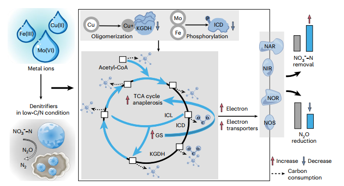 针对低碳氮比(C/N)污(废)水生物脱氮依赖外碳源同时排放大量温室气体的问题,创新提出一种代谢重编程策略(图3),通过引导碳通量进入乙醛酸分流(GS)途径,强化三羧酸循环回补反应,实现低C/N废水高效脱氮并减少温室气体排放,其中总氮去除率提升196.2%、氧化亚氮排放减少51.3%。该效应源于异柠檬酸脱氢酶和α-酮戊二酸脱氢酶被抑制,导致异柠檬酸积累从而激活乙醛酸分流关键酶异柠檬酸裂解酶,优先启动GS驱动的回补代谢。这种碳代谢重编程策略可降低脱氮有机碳需求,提升碳源利用效率。论文第一作者为博士研究生彭浩进,通讯作者为陈银广教授。