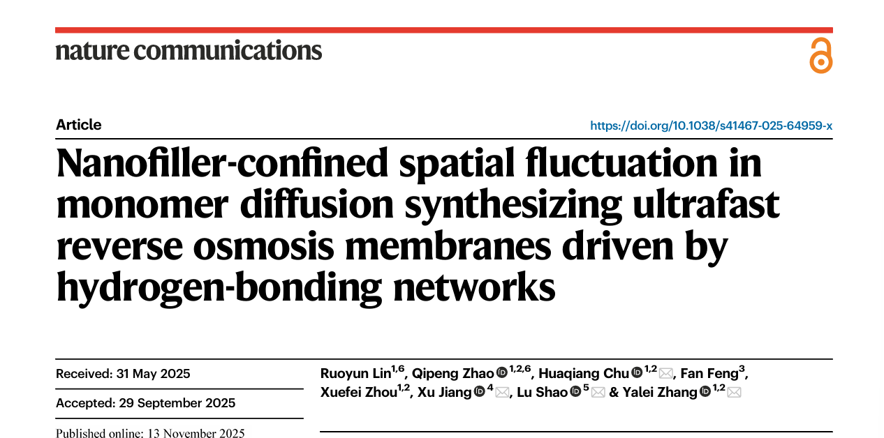 近日,我院张亚雷教授团队在《Nature Communications》发表题为“Nanofiller-confined spatial fluctuation in monomer diffusion synthesizing ultrafast reverse osmosis membranes driven by hydrogen-bonding networks”的研究论文。该研究揭示了通过调控单体空间扩散来控制聚酰胺(PA)层结构与表面拓扑形貌的新机制,为精确控制界面聚合(IP)过程、突破反渗透(RO)膜性能瓶颈提供了新的见解和途径。
