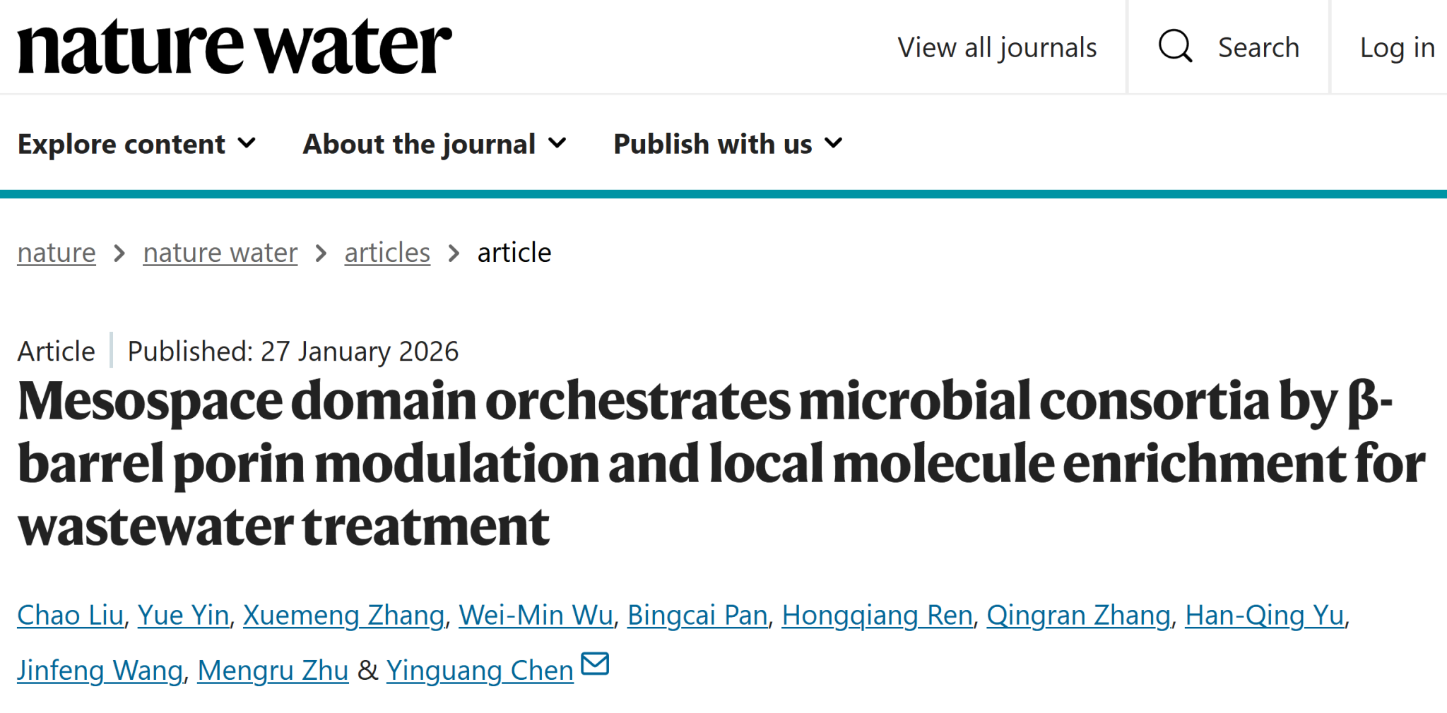 近日,《Nature Water》在线发表了“Mesospace domain orchestrates microbial consortia by β-barrel porin modulation and local molecule enrichment for wastewater treatment”,我院刘超老师为唯一第一作者,陈银广教授为唯一通讯作者。研究工作得到了国家自然科学基金、国家重点研发计划、上海市启明星计划、中国博士后科学基金等项目资助。