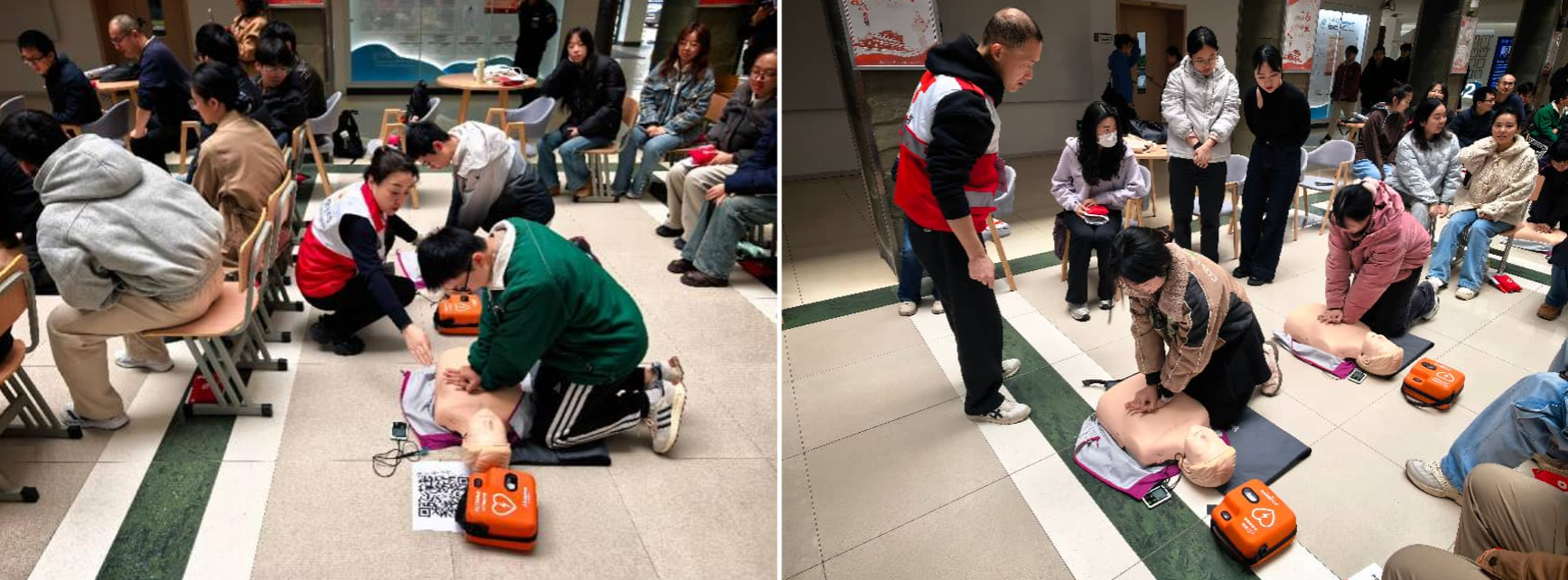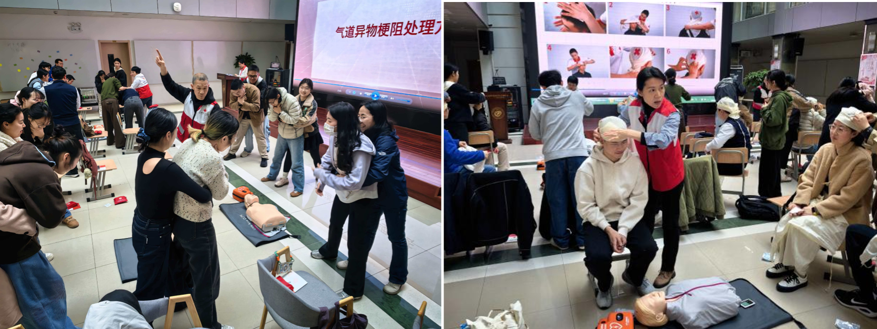 不同于普通办公场景,环境学院师生常年深耕实验室分析、野外生态调研、环境监测等工作,不仅面临化学试剂接触、实验仪器操作损伤等实验室常见风险,在户外调研中还可能遭遇突发晕厥、外伤、异物梗阻等紧急情况,提升全员应急自救互救能力,更是保障师生生命健康、推动教学科研工作平稳有序开展的重要支撑。本次培训精准对接学院师生核心需求,重点聚焦心肺复苏(CPR)、自动体外除颤器(AED)规范使用、气道异物梗阻急救、创伤止血包扎,以及实验室化学灼伤、仪器损伤等专属应急处置模块,既保证理论知识的专业性,又突出实操技能的实用性。